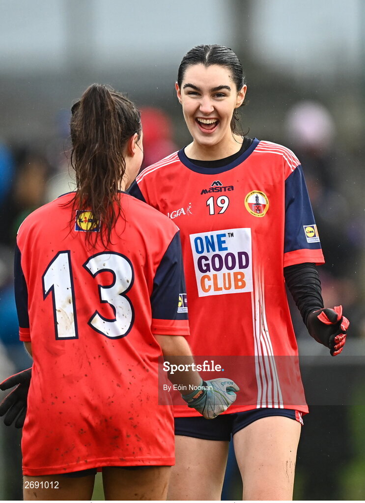 2 December 2023; Áine McCarthy of O'Donovan Rossa celebrates with teammate Éabha O'Donovan after the Currentaccount.ie All-Ireland Ladies Junior Club Championship semi-final match between O’Donovan Rossa of Cork and Gusserane of Wexford at O’Donovan Rossa GAA, Cork. Photo by Eóin Noonan/Sportsfile