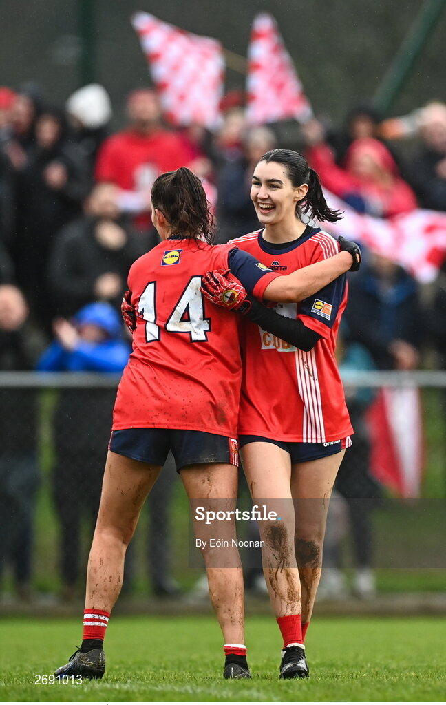 2 December 2023; Áine McCarthy of O'Donovan Rossa celebrates with teammate Kate O'Donovan after the Currentaccount.ie All-Ireland Ladies Junior Club Championship semi-final match between O’Donovan Rossa of Cork and Gusserane of Wexford at O’Donovan Rossa GAA, Cork. Photo by Eóin Noonan/Sportsfile