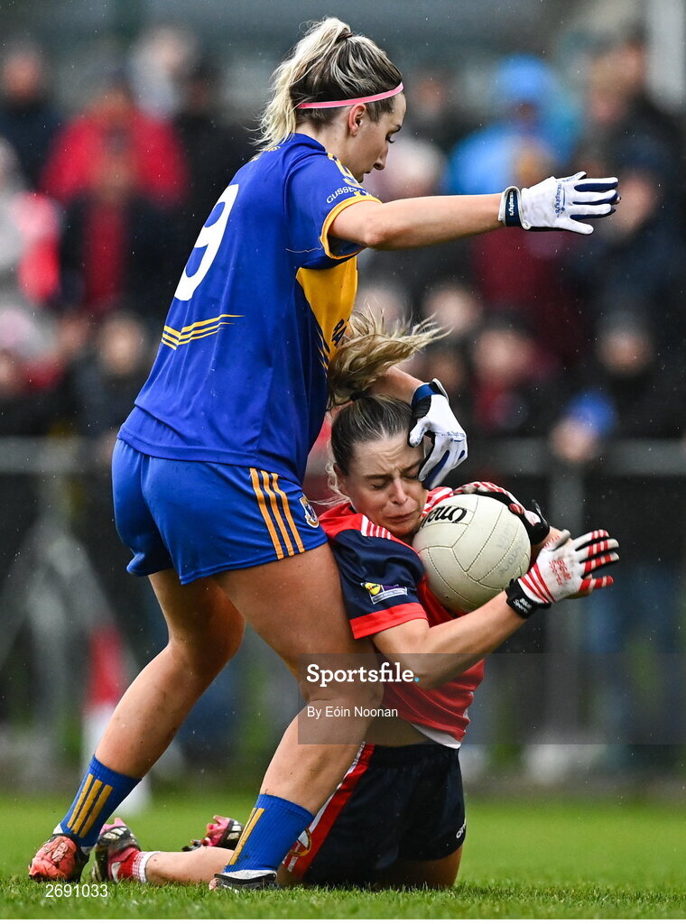 2 December 2023; Laura O'Mahony of O'Donovan Rossa in action against Aoife Ryan of Gusserane during the Currentaccount.ie All-Ireland Ladies Junior Club Championship semi-final match between O’Donovan Rossa of Cork and Gusserane of Wexford at O’Donovan Rossa GAA, Cork. Photo by Eóin Noonan/Sportsfile