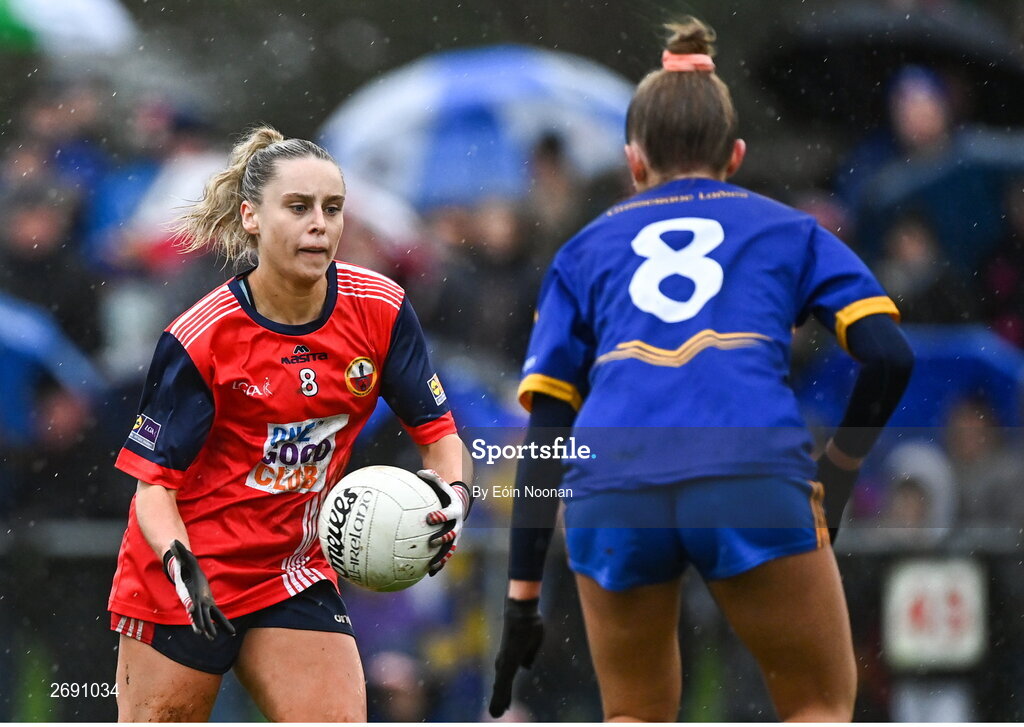 2 December 2023; Laura O'Mahony of O'Donovan Rossa in action against Aisling Ryan of Gusserane during the Currentaccount.ie All-Ireland Ladies Junior Club Championship semi-final match between O’Donovan Rossa of Cork and Gusserane of Wexford at O’Donovan Rossa GAA, Cork. Photo by Eóin Noonan/Sportsfile