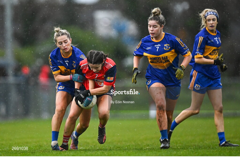 2 December 2023; Lisa Harte of O'Donovan Rossa in action against Ciara Ryan of Gusserane during the Currentaccount.ie All-Ireland Ladies Junior Club Championship semi-final match between O’Donovan Rossa of Cork and Gusserane of Wexford at O’Donovan Rossa GAA, Cork. Photo by Eóin Noonan/Sportsfile
