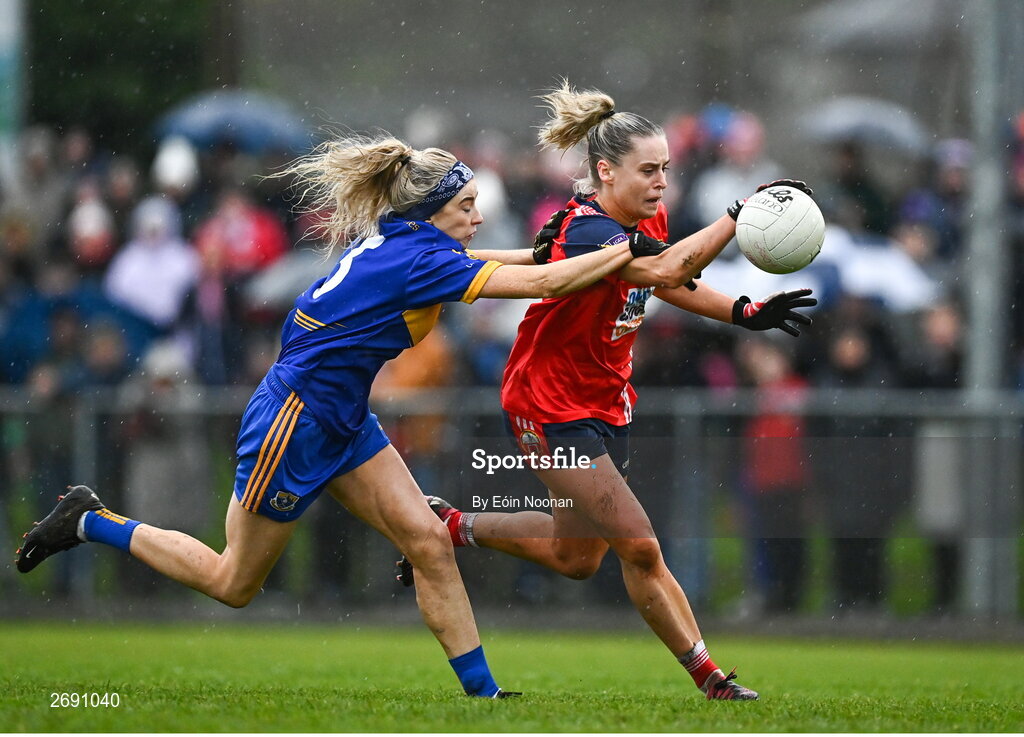 2 December 2023; Laura O'Mahony of O'Donovan Rossa in action against Amanda Power of Gusserane during the Currentaccount.ie All-Ireland Ladies Junior Club Championship semi-final match between O’Donovan Rossa of Cork and Gusserane of Wexford at O’Donovan Rossa GAA, Cork. Photo by Eóin Noonan/Sportsfile