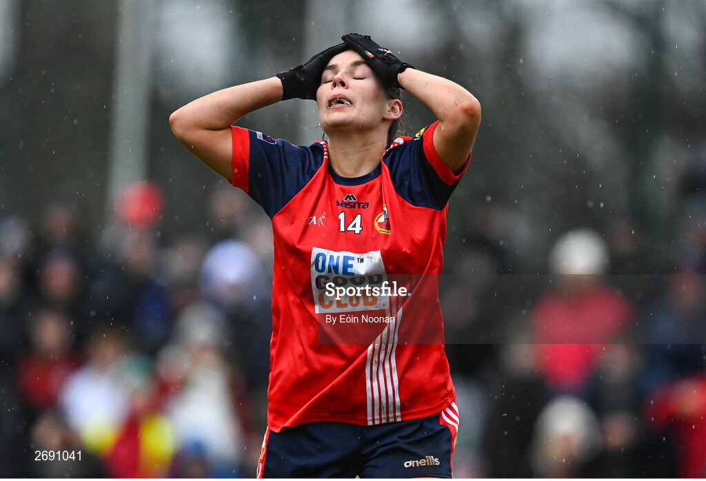 2 December 2023; Kate O'Donovan of O'Donovan Rossa reacts during the Currentaccount.ie All-Ireland Ladies Junior Club Championship semi-final match between O’Donovan Rossa of Cork and Gusserane of Wexford at O’Donovan Rossa GAA, Cork. Photo by Eóin Noonan/Sportsfile