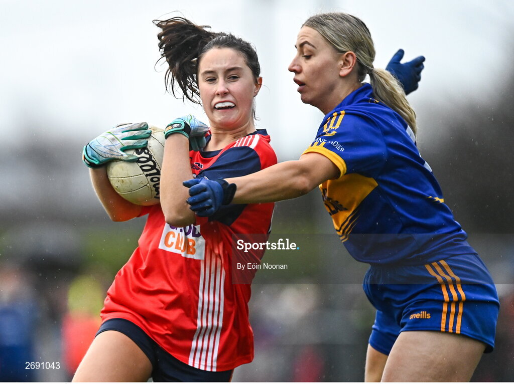 2 December 2023; Éabha O'Donovan of O'Donovan Rossa in action against Anna Breen of Gusserane during the Currentaccount.ie All-Ireland Ladies Junior Club Championship semi-final match between O’Donovan Rossa of Cork and Gusserane of Wexford at O’Donovan Rossa GAA, Cork. Photo by Eóin Noonan/Sportsfile