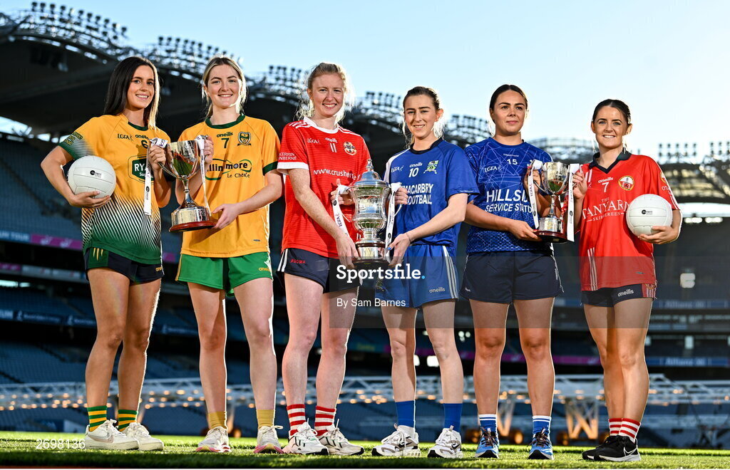 13 December 2023; In attendance at a photocall ahead of the currentaccount.ie All-Ireland Junior, Intermediate and Ladies Senior Club Football Championship Finals next weekend are, from left, Ellen Twomey of Glanmire, Cork, Gráinne Prior of Ballinamore Sean O’Heslins, Leitrim, Louise Ward of Kilkerrin-Clonberne, Galway, Aileen Wall of Ballymacarbry, Waterford, Laura Kelly of Claremorris, Mayo, and Lisa Harte of O’Donovan Rossa, Cork. The Intermediate and Senior Finals will be played at Croke Park on Saturday, December 16, with the Junior Final to be played at Parnell Park, Dublin, on Sunday December 17. Photo by Sam Barnes/Sportsfile