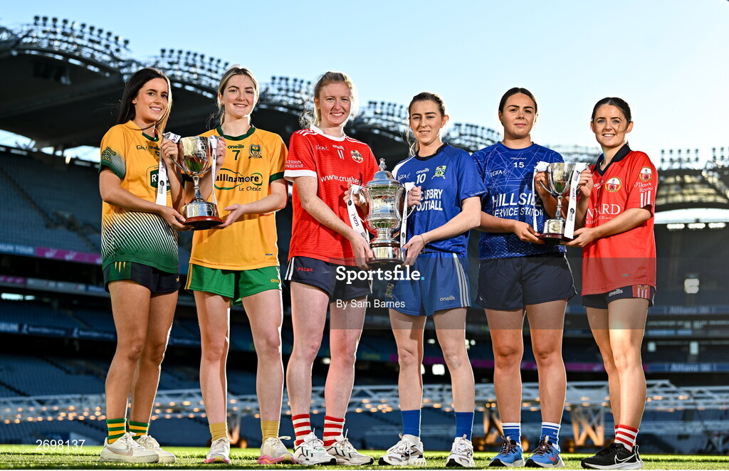 13 December 2023; In attendance at a photocall ahead of the currentaccount.ie All-Ireland Junior, Intermediate and Ladies Senior Club Football Championship Finals next weekend are, from left, Ellen Twomey of Glanmire, Cork, Gráinne Prior of Ballinamore Sean O’Heslins, Leitrim, Louise Ward of Kilkerrin-Clonberne, Galway, Aileen Wall of Ballymacarbry, Waterford, Laura Kelly of Claremorris, Mayo, and Lisa Harte of O’Donovan Rossa, Cork. The Intermediate and Senior Finals will be played at Croke Park on Saturday, December 16, with the Junior Final to be played at Parnell Park, Dublin, on Sunday December 17. Photo by Sam Barnes/Sportsfile