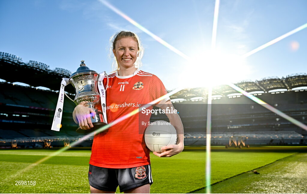 13 December 2023; (EDITORS NOTE: A special effects camera filter was used for this image.) In attendance at a photocall ahead of the currentaccount.ie All-Ireland Junior, Intermediate and Ladies Senior Club Football Championship Finals next weekend is Louise Ward of Kilkerrin-Clonberne, Galway, with the Dolores Tyrrell Memorial Cup. The Intermediate and Senior Finals will be played at Croke Park on Saturday, December 16, with the Junior Final to be played at Parnell Park, Dublin, on Sunday December 17. Photo by Sam Barnes/Sportsfile