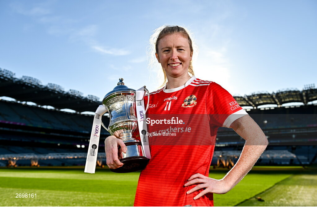 13 December 2023; In attendance at a photocall ahead of the currentaccount.ie All-Ireland Junior, Intermediate and Ladies Senior Club Football Championship Finals next weekend is Louise Ward of Kilkerrin-Clonberne, Galway, with the Dolores Tyrrell Memorial Cup. The Intermediate and Senior Finals will be played at Croke Park on Saturday, December 16, with the Junior Final to be played at Parnell Park, Dublin, on Sunday December 17. Photo by Sam Barnes/Sportsfile