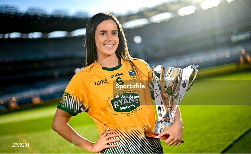 13 December 2023; In attendance at a photocall ahead of the currentaccount.ie All-Ireland Junior, Intermediate and Ladies Senior Club Football Championship Finals next weekend is Ellen Twomey of Glanmire, Cork, with the Intermediate Cup. The Intermediate and Senior Finals will be played at Croke Park on Saturday, December 16, with the Junior Final to be played at Parnell Park, Dublin, on Sunday December 17. Photo by Sam Barnes/Sportsfile