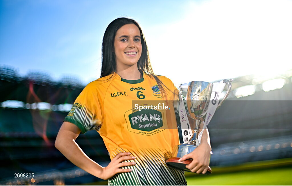 13 December 2023; In attendance at a photocall ahead of the currentaccount.ie All-Ireland Junior, Intermediate and Ladies Senior Club Football Championship Finals next weekend is Ellen Twomey of Glanmire, Cork, with the Intermediate Cup. The Intermediate and Senior Finals will be played at Croke Park on Saturday, December 16, with the Junior Final to be played at Parnell Park, Dublin, on Sunday December 17. Photo by Sam Barnes/Sportsfile