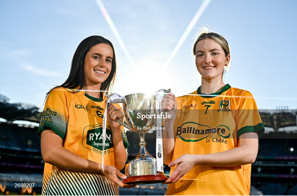 13 December 2023; (EDITORS NOTE: A special effects camera filter was used for this image.) In attendance at a photocall ahead of the currentaccount.ie All-Ireland Junior, Intermediate and Ladies Senior Club Football Championship Finals next weekend are Ellen Twomey of Glanmire, Cork, left, and Gráinne Prior of Ballinamore Sean O’Heslins, Leitrim, with the Intermediate Cup. The Intermediate and Senior Finals will be played at Croke Park on Saturday, December 16, with the Junior Final to be played at Parnell Park, Dublin, on Sunday December 17. Photo by Sam Barnes/Sportsfile