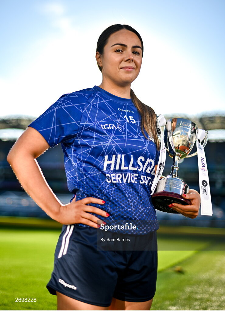 13 December 2023; In attendance at a photocall ahead of the currentaccount.ie All-Ireland Junior, Intermediate and Ladies Senior Club Football Championship Finals next weekend is Laura Kelly of Claremorris, Mayo, with the Junior Cup. The Intermediate and Senior Finals will be played at Croke Park on Saturday, December 16, with the Junior Final to be played at Parnell Park, Dublin, on Sunday December 17. Photo by Sam Barnes/Sportsfile