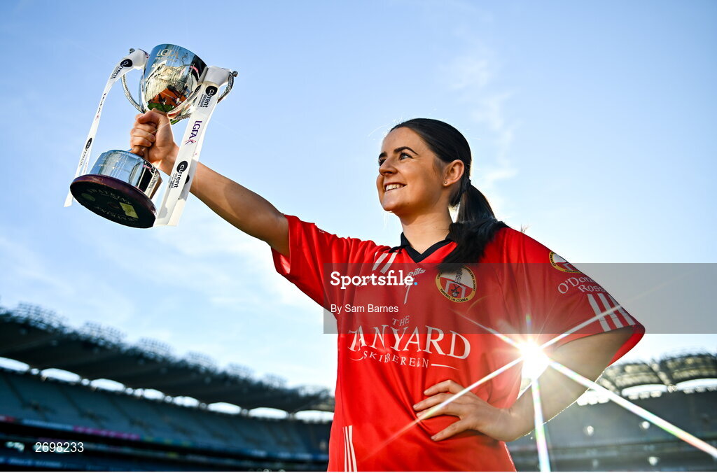 13 December 2023; (EDITORS NOTE: A special effects camera filter was used for this image.) In attendance at a photocall ahead of the currentaccount.ie All-Ireland Junior, Intermediate and Ladies Senior Club Football Championship Finals next weekend is Lisa Harte of O’Donovan Rossa, Cork with the Junior Cup. The Intermediate and Senior Finals will be played at Croke Park on Saturday, December 16, with the Junior Final to be played at Parnell Park, Dublin, on Sunday December 17. Photo by Sam Barnes/Sportsfile