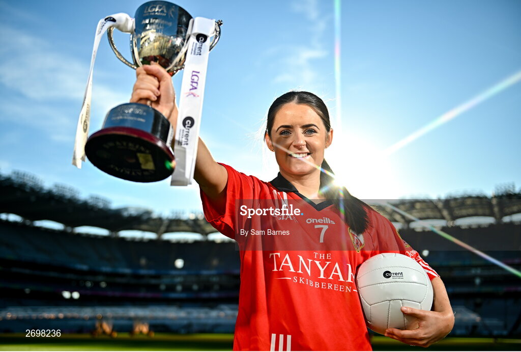 13 December 2023; (EDITORS NOTE: A special effects camera filter was used for this image.) In attendance at a photocall ahead of the currentaccount.ie All-Ireland Junior, Intermediate and Ladies Senior Club Football Championship Finals next weekend is Lisa Harte of O’Donovan Rossa, Cork with the Junior Cup. The Intermediate and Senior Finals will be played at Croke Park on Saturday, December 16, with the Junior Final to be played at Parnell Park, Dublin, on Sunday December 17. Photo by Sam Barnes/Sportsfile