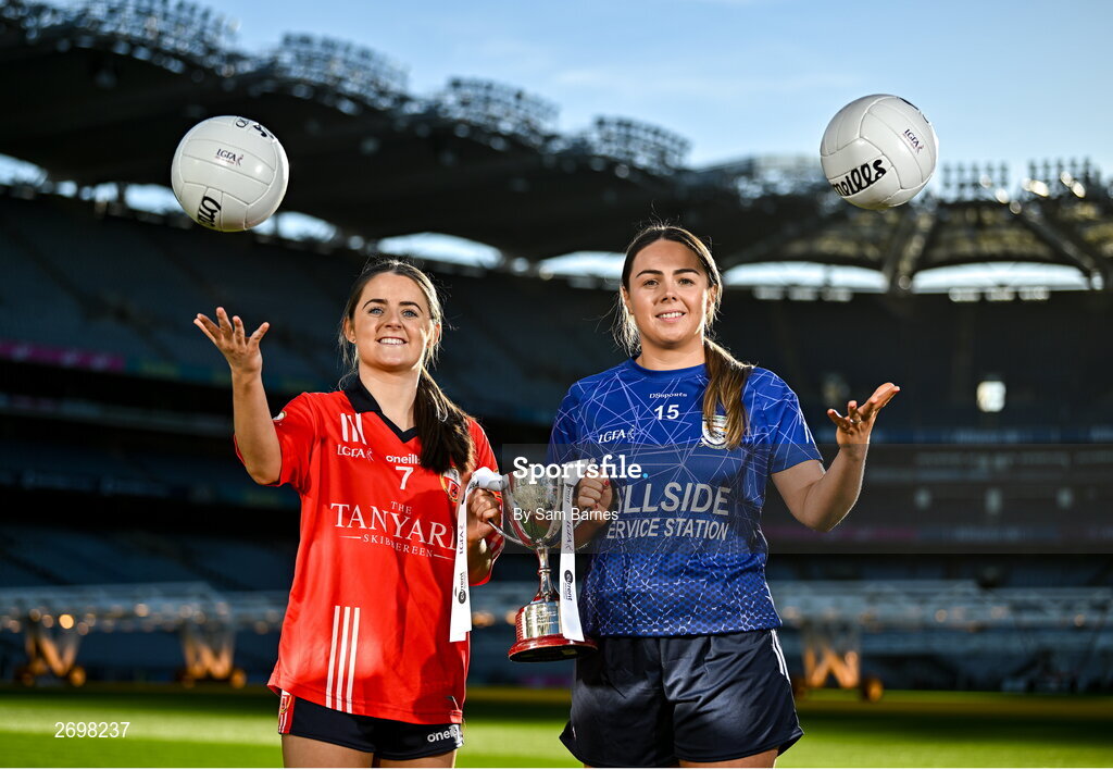 13 December 2023; In attendance at a photocall ahead of the currentaccount.ie All-Ireland Junior, Intermediate and Ladies Senior Club Football Championship Finals next weekend are Lisa Harte of O’Donovan Rossa, Cork, left, and Laura Kelly of Claremorris, Mayo, with the Junior Cup . The Intermediate and Senior Finals will be played at Croke Park on Saturday, December 16, with the Junior Final to be played at Parnell Park, Dublin, on Sunday December 17. Photo by Sam Barnes/Sportsfile