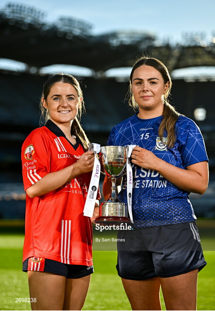 13 December 2023; In attendance at a photocall ahead of the currentaccount.ie All-Ireland Junior, Intermediate and Ladies Senior Club Football Championship Finals next weekend are Lisa Harte of O’Donovan Rossa, Cork, left, and Laura Kelly of Claremorris, Mayo, with the Junior Cup . The Intermediate and Senior Finals will be played at Croke Park on Saturday, December 16, with the Junior Final to be played at Parnell Park, Dublin, on Sunday December 17. Photo by Sam Barnes/Sportsfile