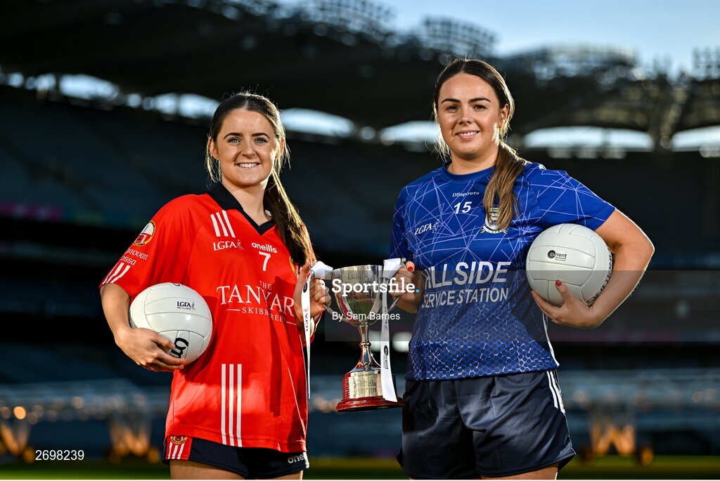 13 December 2023; In attendance at a photocall ahead of the currentaccount.ie All-Ireland Junior, Intermediate and Ladies Senior Club Football Championship Finals next weekend are Lisa Harte of O’Donovan Rossa, Cork, left, and Laura Kelly of Claremorris, Mayo, with the Junior Cup . The Intermediate and Senior Finals will be played at Croke Park on Saturday, December 16, with the Junior Final to be played at Parnell Park, Dublin, on Sunday December 17. Photo by Sam Barnes/Sportsfile