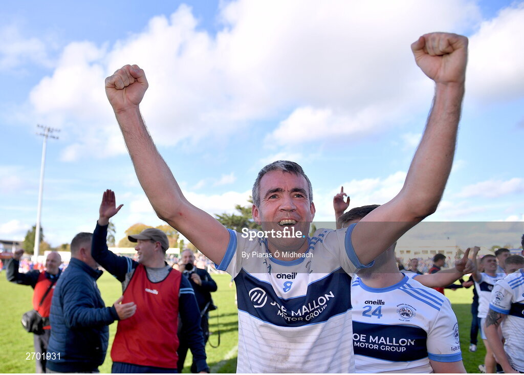 22 October 2023; Man of the Match Johnny Doyle of Allenwood, 45 years old and who made his debut his adult club football championship debut in 1996, celebrates after his side's victory in the Kildare County Intermediate Club Football Championship final between Castledermot and Allenwood at Netwatch Cullen Park in Carlow. Photo by Piaras Ó Mídheach/Sportsfile