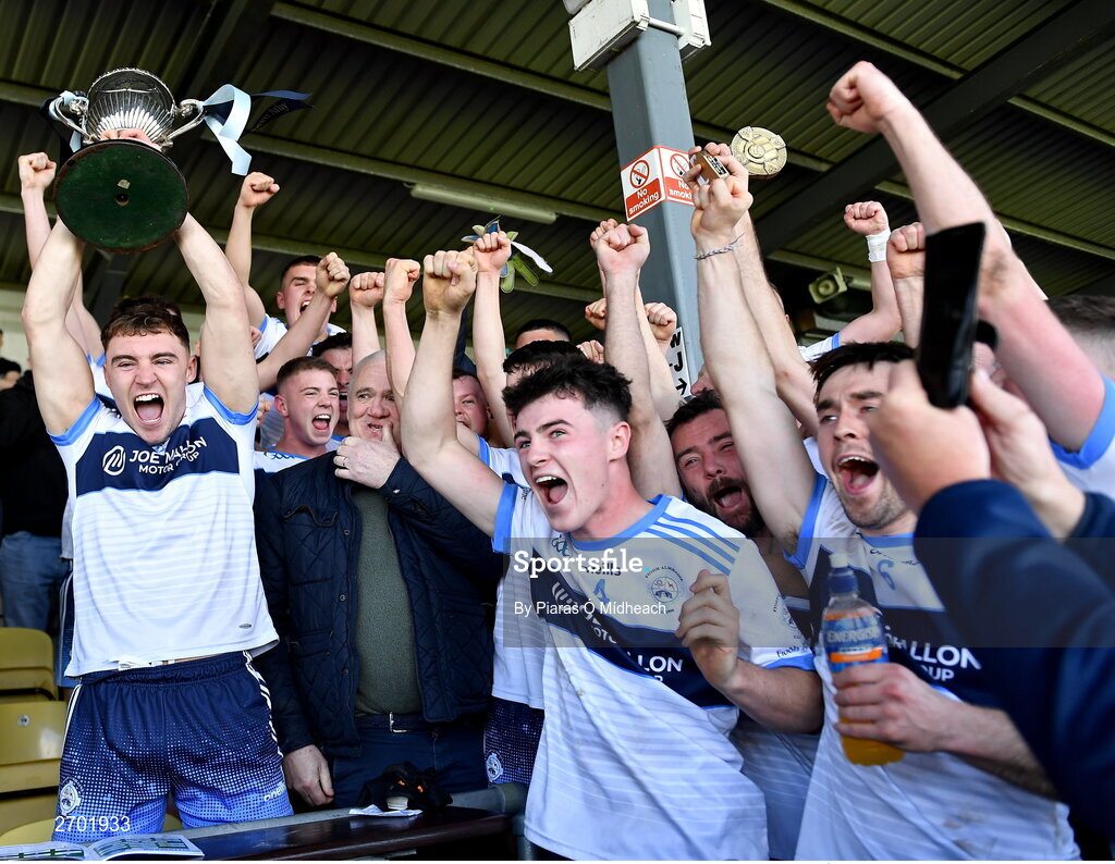 22 October 2023; Allenwood captain Rory Moran lifts the cup after his side's victory in the Kildare County Intermediate Club Football Championship final between Castledermot and Allenwood at Netwatch Cullen Park in Carlow. Photo by Piaras Ó Mídheach/Sportsfile