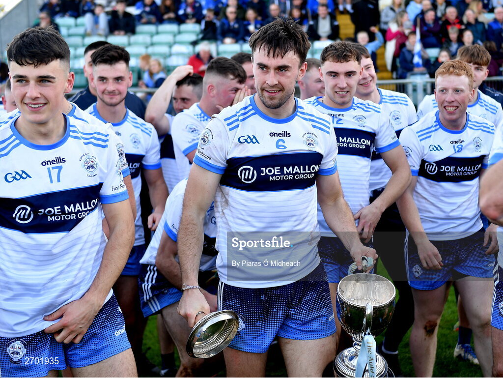 22 October 2023; Darragh Malone of Allenwood with the cup after his side's victory in the Kildare County Intermediate Club Football Championship final between Castledermot and Allenwood at Netwatch Cullen Park in Carlow. Photo by Piaras Ó Mídheach/Sportsfile