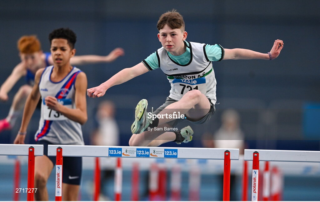 28 January 2024; J P Guerin of Midleton AC, Cork, competes in the 60m hurdles of the under 15 boys combined events during day two of 123.ie National Indoor Combined Events at the Sport Ireland National Indoor Arena in Dublin. Photo by Sam Barnes/Sportsfile