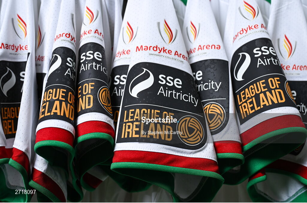 29 January 2024; A detailed view of the SSE Airtricity League of Ireland badge on the Cork City jersey sleeve during a Cork City FC squad portraits session at Bishopstown Stadium in Cork. Photo by Stephen McCarthy/Sportsfile