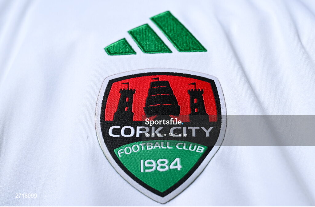 29 January 2024; A detailed view of the Cork City crest and adidas logo on their jersey during a Cork City FC squad portraits session at Bishopstown Stadium in Cork. Photo by Stephen McCarthy/Sportsfile