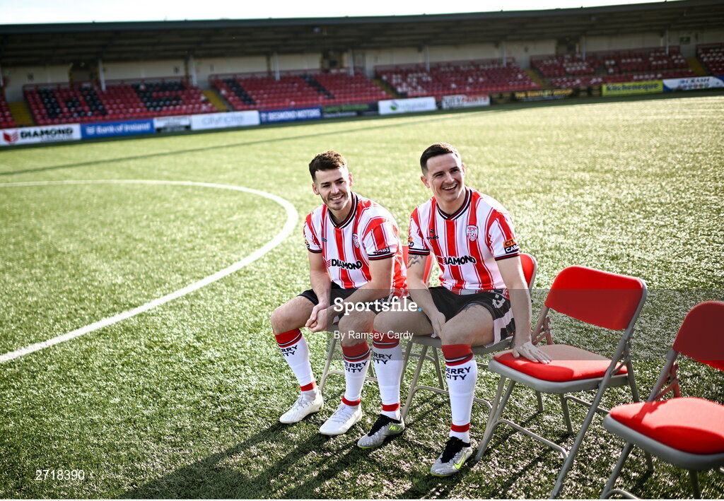 29 January 2024; Danny Mullen, left, and Ciaran Coll wait for the start of the Derry City FC team photograph at The Ryan McBride Brandywell Stadium in Derry. Photo by Ramsey Cardy/Sportsfile