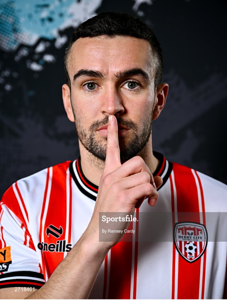 29 January 2024; Michael Duffy during a Derry City FC squad portrait session at The Ryan McBride Brandywell Stadium in Derry. Photo by Ramsey Cardy/Sportsfile