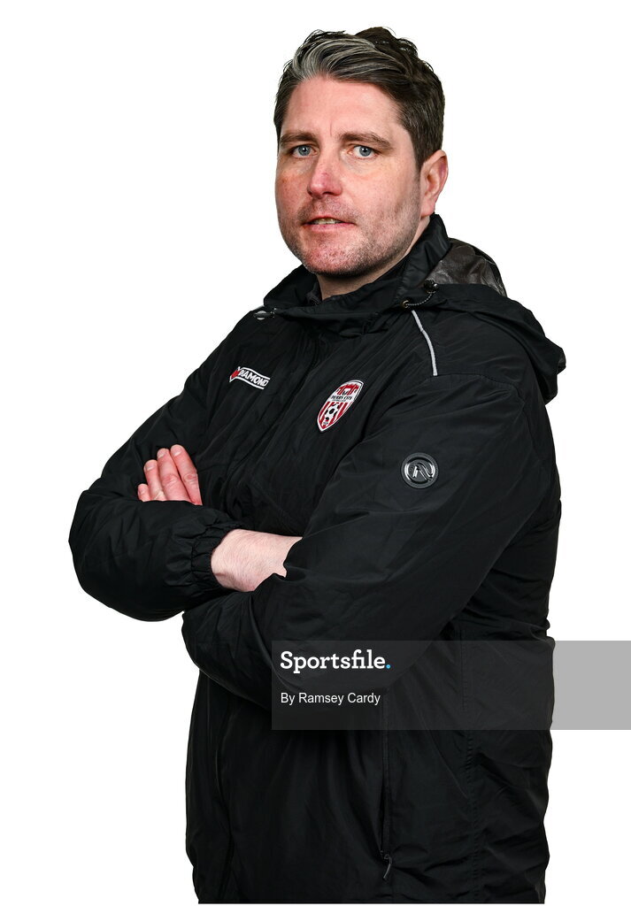 29 January 2024; Manager Ruaidhrí Higgins during a Derry City FC squad portrait session at The Ryan McBride Brandywell Stadium in Derry. Photo by Ramsey Cardy/Sportsfile