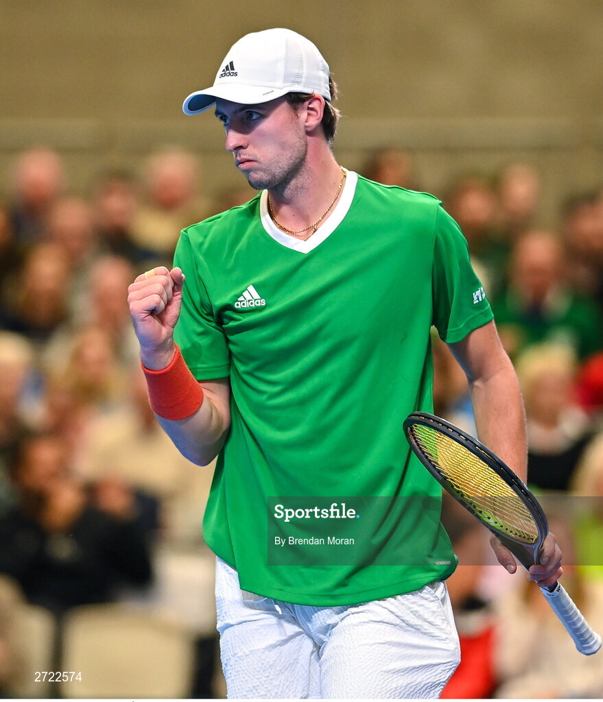 3 February 2024; Osgar Ó hOisín of Ireland celebrates winning a point against Sebastian Ofner of Austria during their singles match on day one of the Davis Cup World Group I Play-off 1st Round match between Ireland and Austria at UL Sport Arena in Limerick. Photo by Brendan Moran/Sportsfile