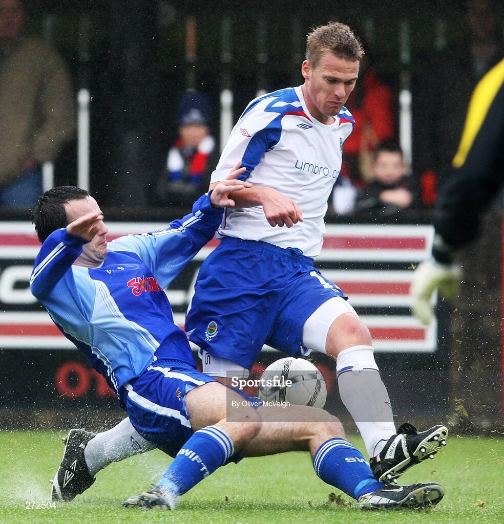 27 October 2007; Peter Thompson, Linfield, in action against John Curran, Dungannon Swifts. Carnegie Premier League, Dungannon Swifts v Linfield, Stangmore Park, Dungannon, co. Tyrone. Picture credit; Oliver McVeigh / SPORTSFILE