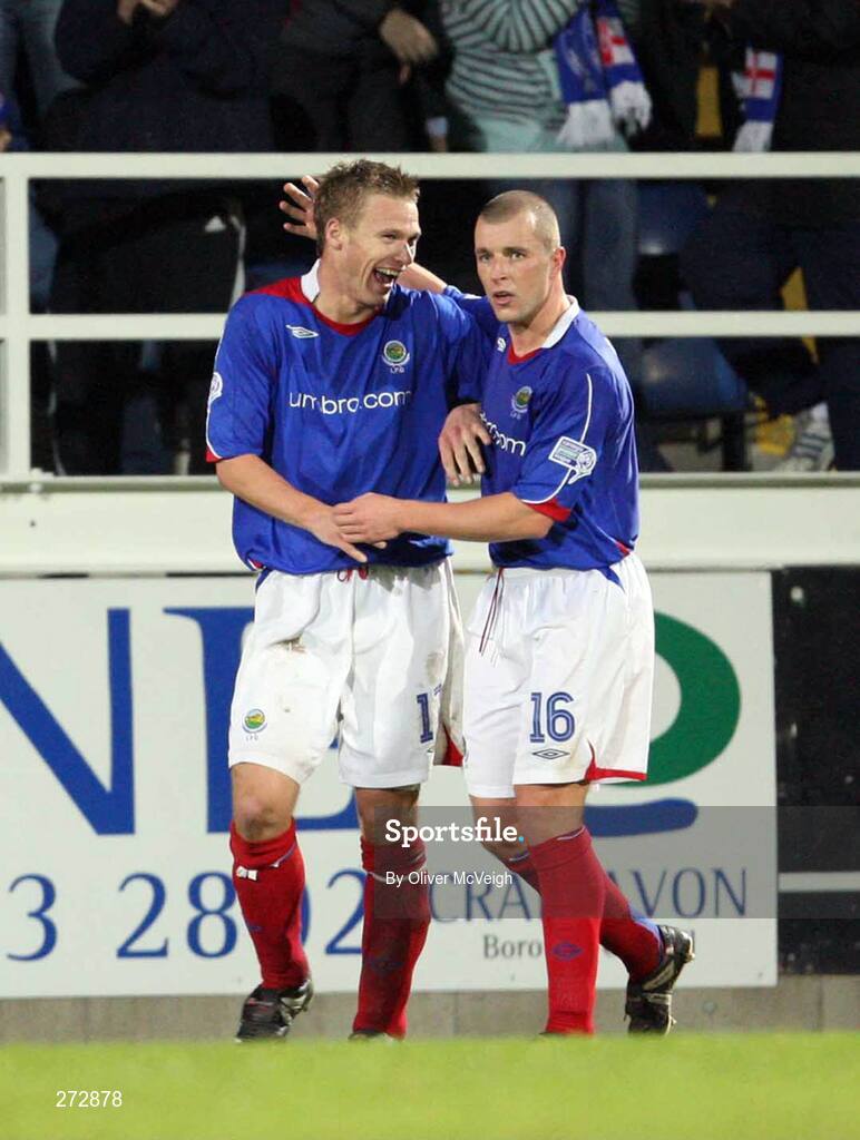 7 November 2007; Peter Thompson, Linfield, left, celebrates with team-mate Aidan O'Kane after scoring his side's equalising goal. CIS Insurance Cup semi-final, Linfield v Newry City, Mourneview Park, Lurgan, Co. Armagh. Picture credit; Oliver McVeigh / SPORTSFILE