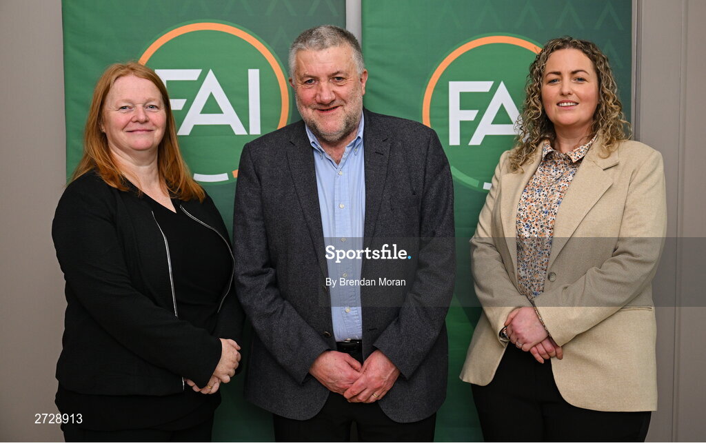 10 February 2024; Ursula Scully and Laura Finnegan O’Halloran have been elected to the FAI Board following a General Assembly Meeting at Carlton Hotel Dublin to ensure that the FAI has met the Government gender balance requirement. Pictured are football director Ursula Scully of the Munster Football Association, left, and independent director Laura Finnegan O’Halloran with FAI president Paul Cooke. Photo by Brendan Moran/Sportsfile