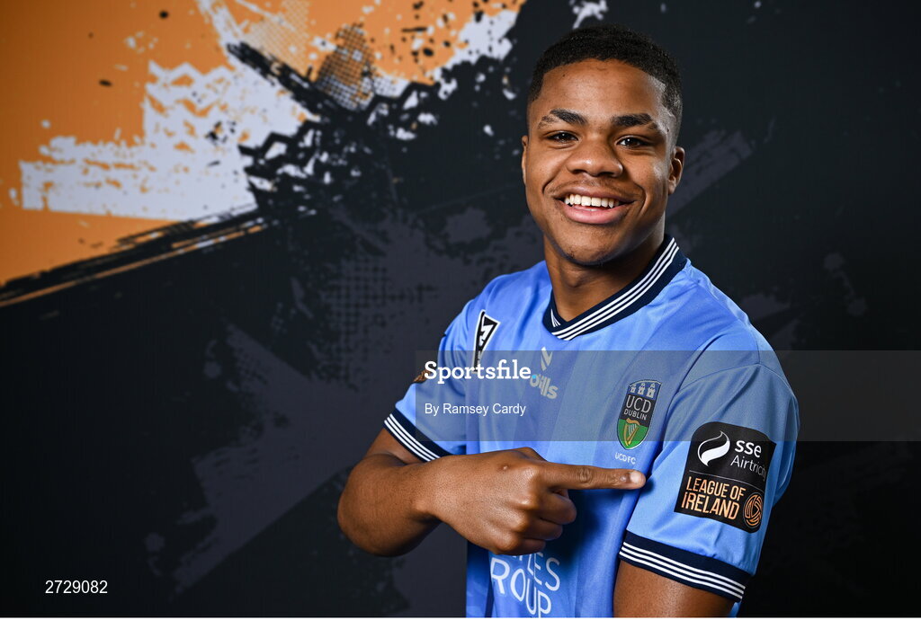 9 February 2024; Matthew Alonge poses for a portrait during a UCD FC squad portraits session at UCD Bowl in Dublin. Photo by Ramsey Cardy/Sportsfile