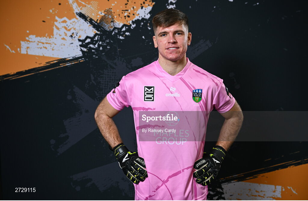 9 February 2024; Goalkeeper Kian Moore poses for a portrait during a UCD FC squad portraits session at UCD Bowl in Dublin. Photo by Ramsey Cardy/Sportsfile