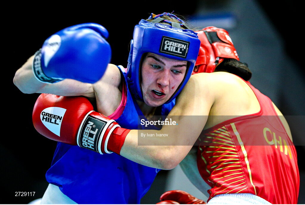 10 February 2024; Aoife O'Rourke of Ireland, left, in action against Li Qian of China in their middleweight 75kg semi-final bout during the 75th International Boxing Tournament Strandja in Sofia, Bulgaria. Photo by Ivan Ivanov/Sportsfile