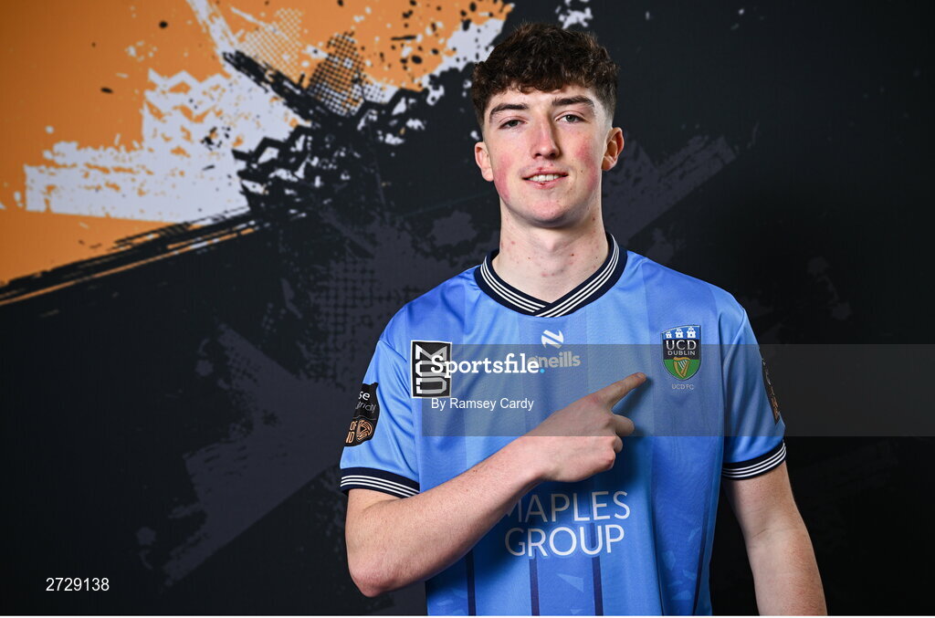 9 February 2024; Mikey Raggett poses for a portrait during a UCD FC squad portraits session at UCD Bowl in Dublin. Photo by Ramsey Cardy/Sportsfile