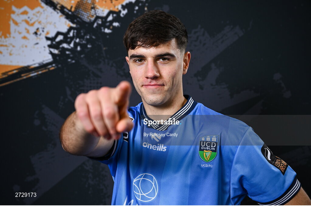 9 February 2024; Mikey McCullagh poses for a portrait during a UCD FC squad portraits session at UCD Bowl in Dublin. Photo by Ramsey Cardy/Sportsfile
