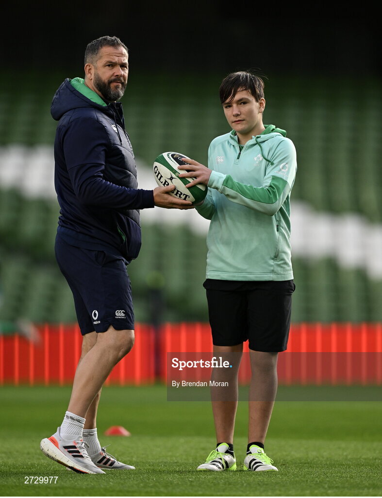 10 February 2024; Head coach Andy Farrell with his son Gabriel during an Ireland Rugby captain's run at the Aviva Stadium in Dublin. Photo by Brendan Moran/Sportsfile