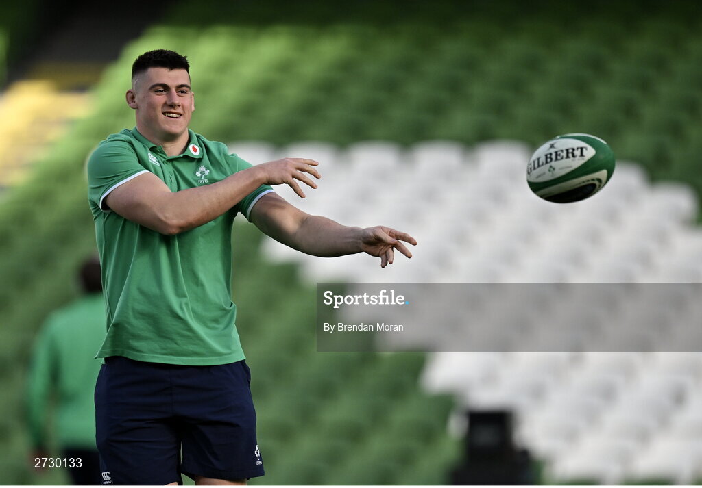 11 February 2024; Dan Sheehan of Ireland warms-up before the Guinness Six Nations Rugby Championship match between Ireland and Italy at the Aviva Stadium in Dublin. Photo by Brendan Moran/Sportsfile