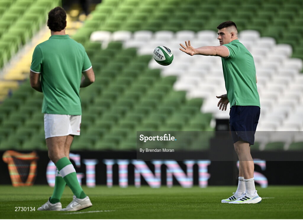 11 February 2024; Dan Sheehan of Ireland, right, and team-mate Caelan Doris warm-up before the Guinness Six Nations Rugby Championship match between Ireland and Italy at the Aviva Stadium in Dublin. Photo by Brendan Moran/Sportsfile