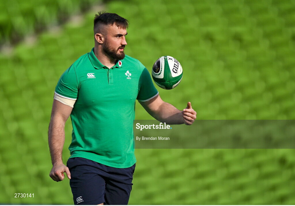 11 February 2024; Rónan Kelleher of Ireland warms-up before the Guinness Six Nations Rugby Championship match between Ireland and Italy at the Aviva Stadium in Dublin. Photo by Brendan Moran/Sportsfile