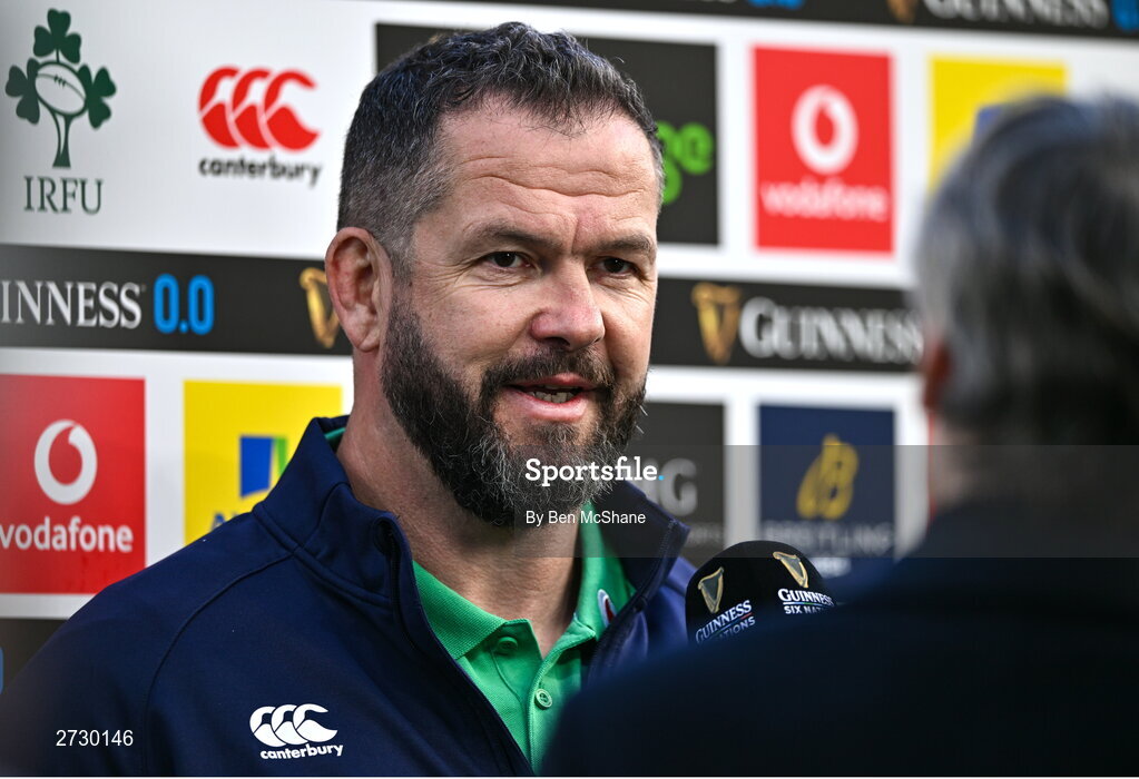 11 February 2024; Ireland head coach Andy Farrell is interviewed before the Guinness Six Nations Rugby Championship match between Ireland and Italy at the Aviva Stadium in Dublin. Photo by Ben McShane/Sportsfile