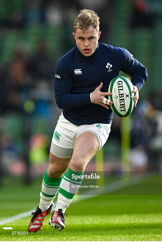 11 February 2024; Craig Casey of Ireland warms-up before the Guinness Six Nations Rugby Championship match between Ireland and Italy at the Aviva Stadium in Dublin. Photo by Brendan Moran/Sportsfile