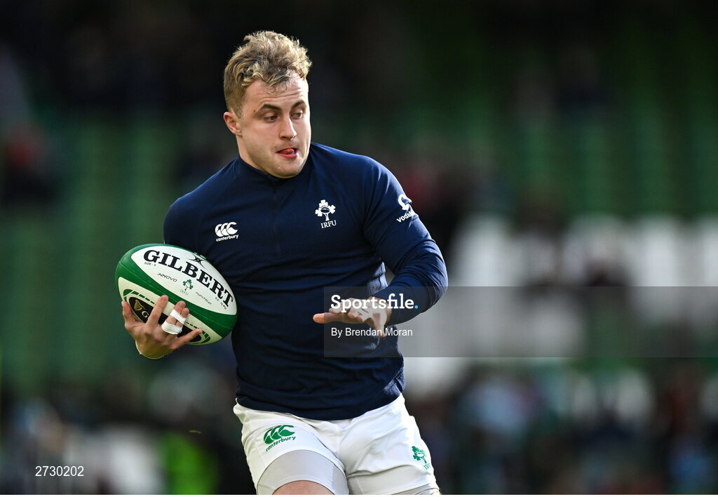 11 February 2024; Craig Casey of Ireland warms-up before the Guinness Six Nations Rugby Championship match between Ireland and Italy at the Aviva Stadium in Dublin. Photo by Brendan Moran/Sportsfile