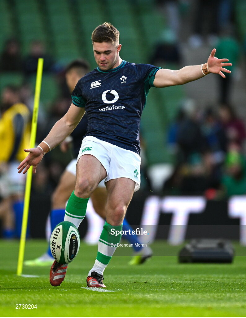 11 February 2024; Jack Crowley of Ireland warms-up before the Guinness Six Nations Rugby Championship match between Ireland and Italy at the Aviva Stadium in Dublin. Photo by Brendan Moran/Sportsfile
