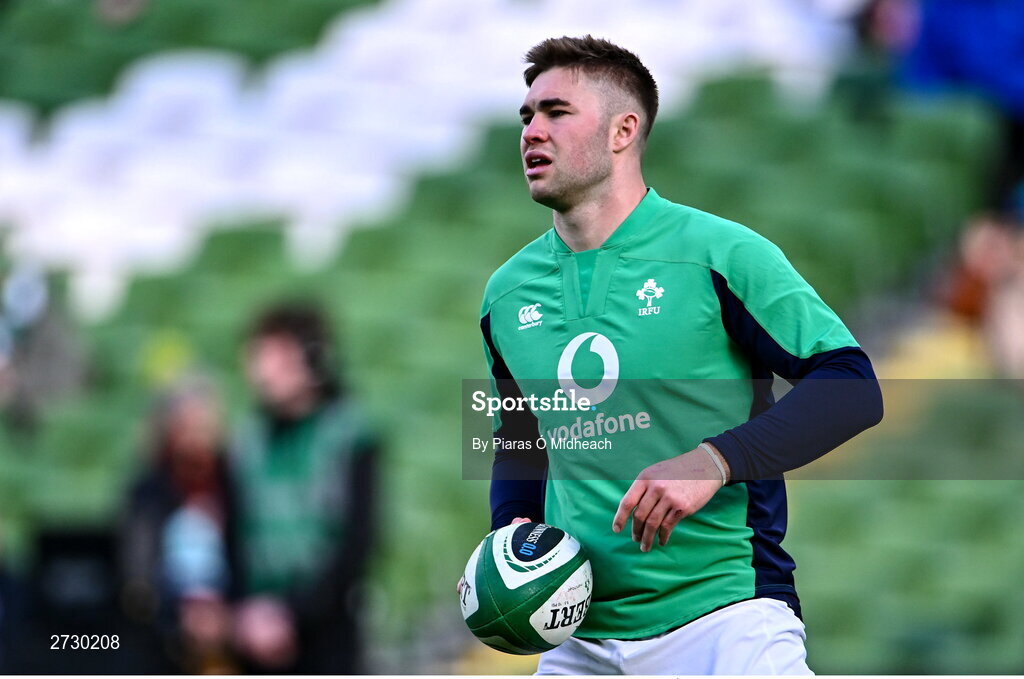 11 February 2024; Jack Crowley of Ireland before the Guinness Six Nations Rugby Championship match between Ireland and Italy at the Aviva Stadium in Dublin. Photo by Piaras Ó Mídheach/Sportsfile