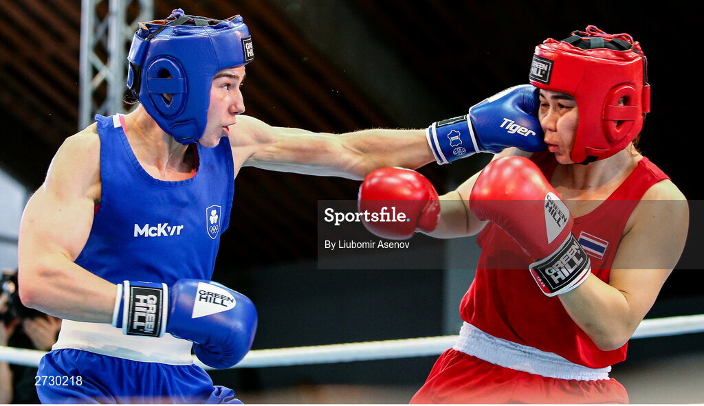 11 February 2024; Aoife O'Rourke of Ireland, left, in action against Baison Manikon of Thailand in their middleweight 75kg final bout during the 75th International Boxing Tournament Strandja in Sofia, Bulgaria. Photo by Liubomir Asenov /Sportsfile