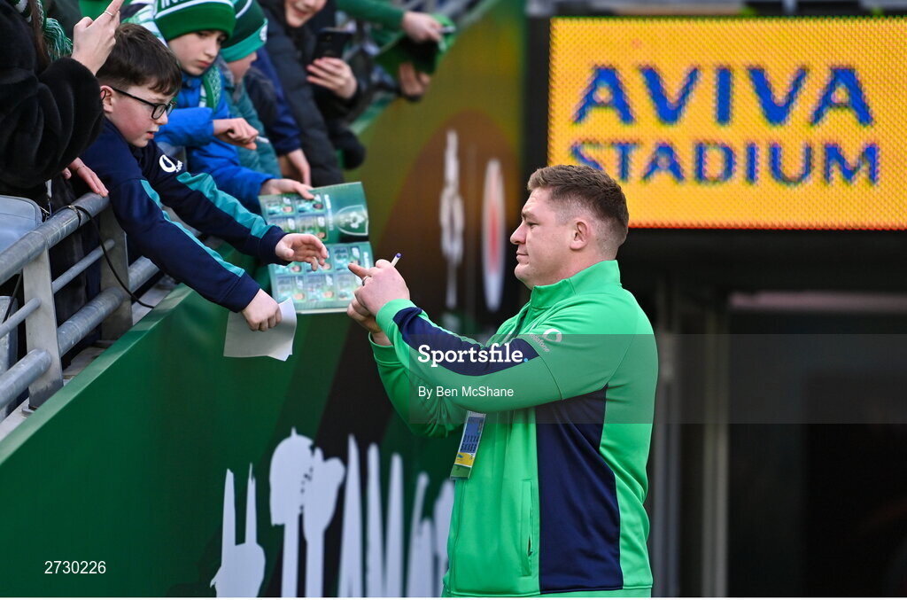 11 February 2024; Tadhg Furlong of Ireland signs autographs for supporters before the Guinness Six Nations Rugby Championship match between Ireland and Italy at the Aviva Stadium in Dublin. Photo by Ben McShane/Sportsfile